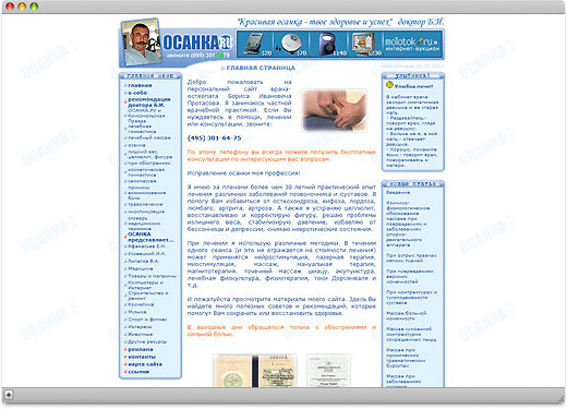 Существование сайта ОСАНКА.РУ, появившегося в Сети 20 марта 2002 года, не осталось незамеченным огромным числом благодарных посетителей и... представителей средств массовой информации! По прошествии нескольких месяцев с момента появления сайта в Сети, Борису Ивановичу поступило предложение от администрации газеты Комсомольская Правда стать постоянным консультантом раздела "Здоровье". Под руководством доктора Протасова вышло множество специализированных статей, электронные версии которых вы можете найти на ОСАНКЕ.РУ.