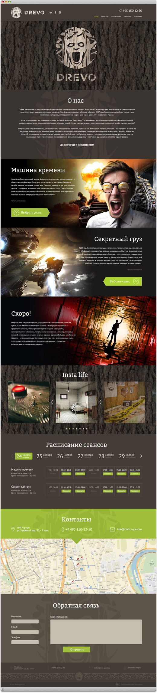 Сайт компании Drevo, организующей квесты - новый вид развлечений, позволяющий оторваться от компьютера. Уникальный дизайн, удобная система управления расписанием сеансов, заказ и оплата без модуля интернет-магазин!