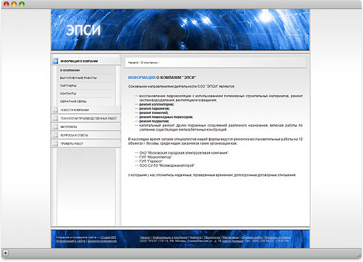 Основными направлениями деятельности ООО "ЭПСИ" являются: восстановление гидроизоляции с использованием полимерных строительных материалов, ремонт систем водоудаления, вентиляции и освещения; ремонт коллекторов; ремонт паркингов; ремонт тоннелей; ремонт пешеходных переходов; ремонт подвалов; капитальный ремонт других подземных сооружений различного назначения, включая работы по усилению существующих железобетонных конструкций.