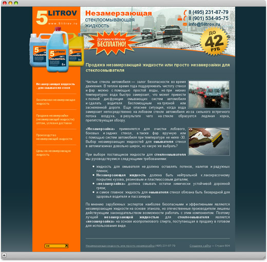 На сайте 5litrov.ru можно приобрести или взять на реализацию незамерзающую жидкость для стеклоомывателей автомобилей. На сайте реализована удобная система заказа - покупатель самостоятельно может оформить и распечатать счет для оплаты товара.