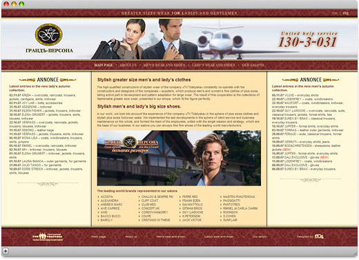 На сайте представлены каталог категорий и брендов, имеющихся в продаже в текущем сезоне, информация о компании и список адресов салонов.