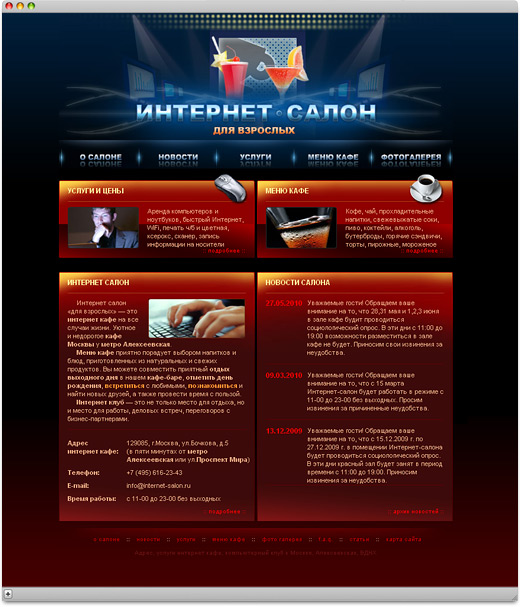 Сайт содержит информацию о режиме работы салона, предоставляемых услугах, новости, меню кафе, контактные данные и фотогалерею.