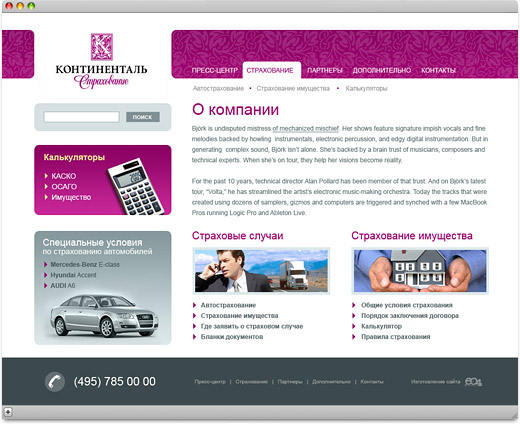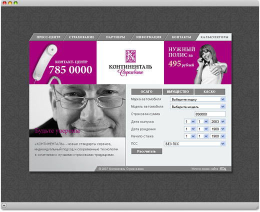 На сайте представлена информация о деятельности компании, проводимых акциях, партнерах компании, контактные данные, форма обратной связи, а также калькуляторы расчета страхования имущества, КАСКО и ОСАГО.